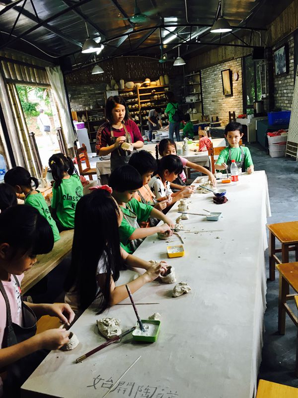 吃完菜色不多、但分量很足的农家菜后,孩子们来到了“从陶开始”,与陶泥亲密接触。大家分组坐下,转盘、刻板、圆规刀、锤子这些东西引起了孩子们极大的好奇心,个个都跃跃欲试。等老师讲解完以后,小家伙们就开始动手了,一小时后,展现在我们面前的是一件件精美的作品:小茶杯、小动物、小花瓶、土豆地雷、豌豆……第一次做虽然没那么精致,但大家都很投入,很认真,觉得自己都有艺术家的天赋哩!