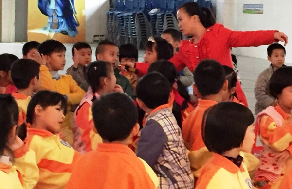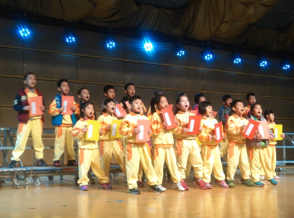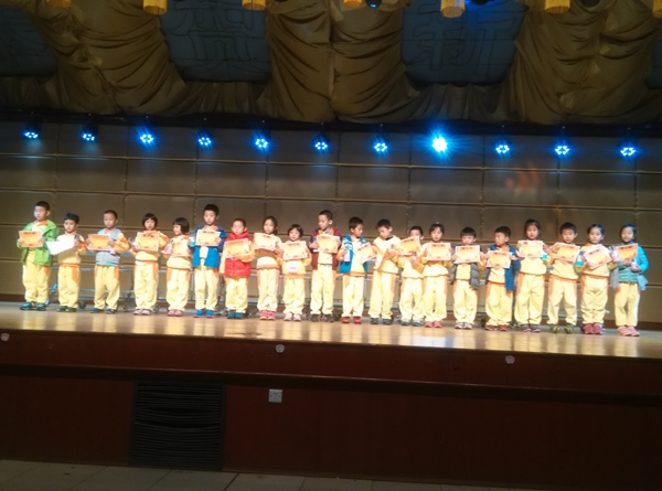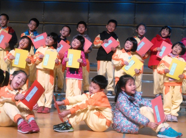 综合馆内一切就绪,孩子们就座后,朱小琳老师亲切活泼的主持让现场的气氛变得更热烈。首先是四个班轮番上阵,依次上台朗诵选自《日有所诵》里的儿歌。生动有趣的儿歌,富有想象力,让孩子们迅速找到共鸣,他们声音响亮,自信大方,读到会心处还情不自禁地露出了笑容。接着,《三字经》新唱节目的小演员们登台表演,他们利用中午的休息时间进行训练,短短一周,节目的质量却毫不含糊,把台下的大小观众都吸引得目不转睛。小演员们精彩的表演博得了全场热烈的掌声。