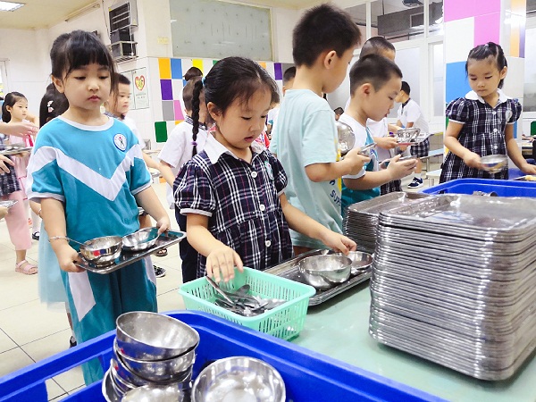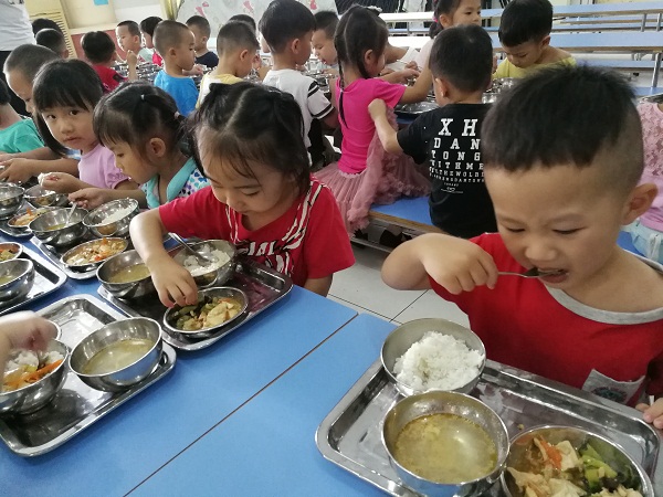 还记得幼儿园那香喷喷的早餐和午餐吗?看,孩子吃得多香呀!进餐完毕,孩子们自觉排好队,把餐具摆放整齐。