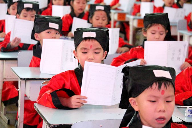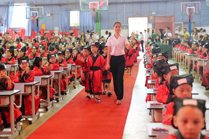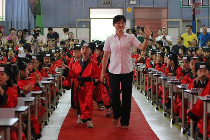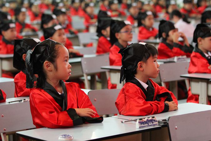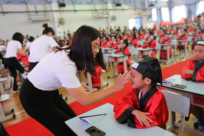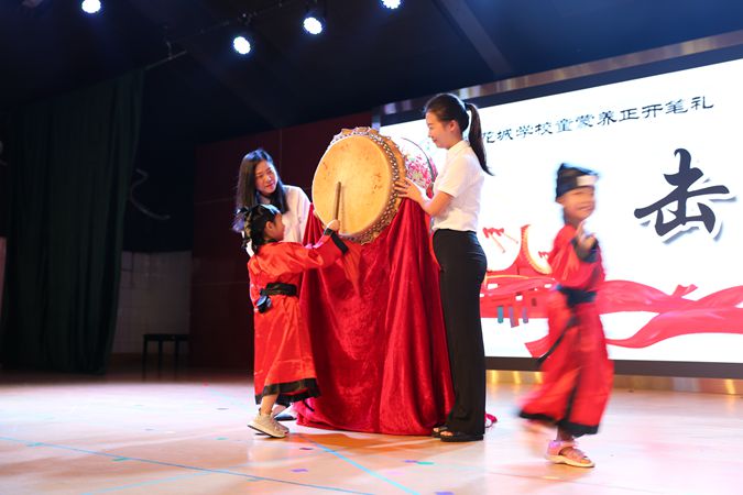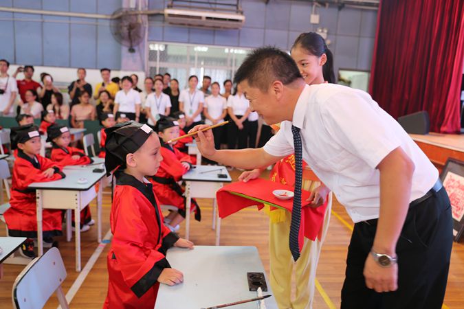 本次“开笔礼”仪式包括:正衣冠、拜师、朱砂启智、击鼓明志、启蒙描红、诵读经典等六大环节。