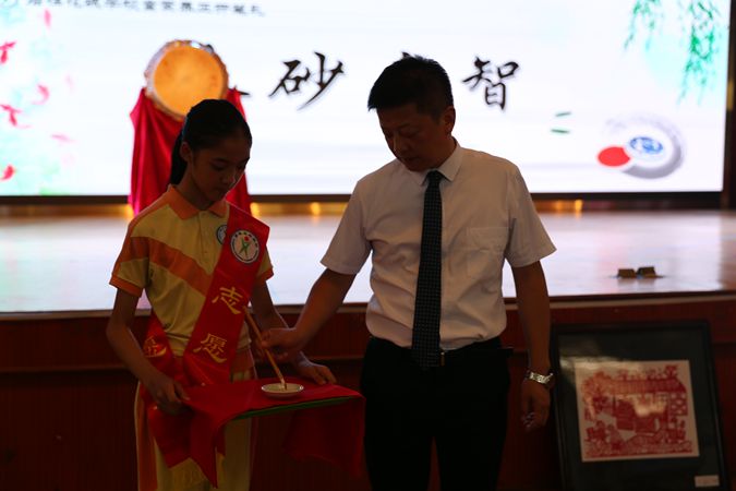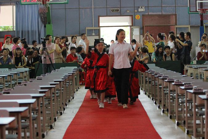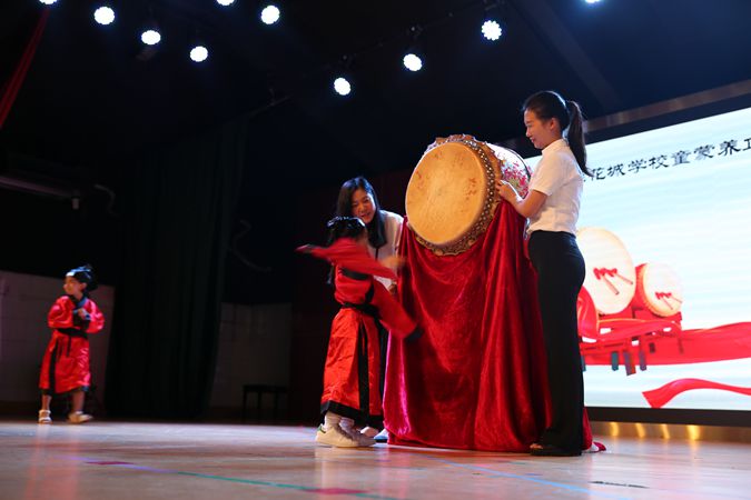 点完红痣,孩子们井然有序地排着队伍、挥动小手、操起鼓槌,击鼓声铿镪有力,这叫“击鼓明志”。其目的在于让孩子耳聪目明、茅塞顿开、表明自己的志向。