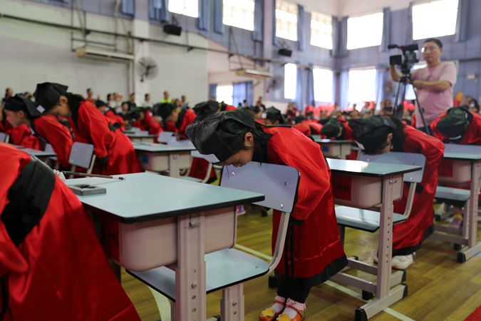 正衣冠结束后,孩子们一拜先师孔子,二拜师长,三拜同学。以此表达对师长、对同学的尊敬,并引导他们学习 中国优秀传统文化,并受其熏陶,成为一个有文化底蕴的人。