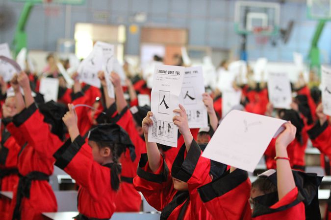 “正衣冠”、“启智”、“明志”之后,孩子们起笔描红。在书法老师的指导下学习写“人”字。之所以选择这个笔画简单、而意义深远的汉字,是因为希望孩子们从今往后,能领悟到做人的道理。子曰:“仁者爱人。”“已欲立而立人,已欲达而达人。”“已所不欲,勿施与人。”老师们期望着孩子们能发奋图强,博学知礼。