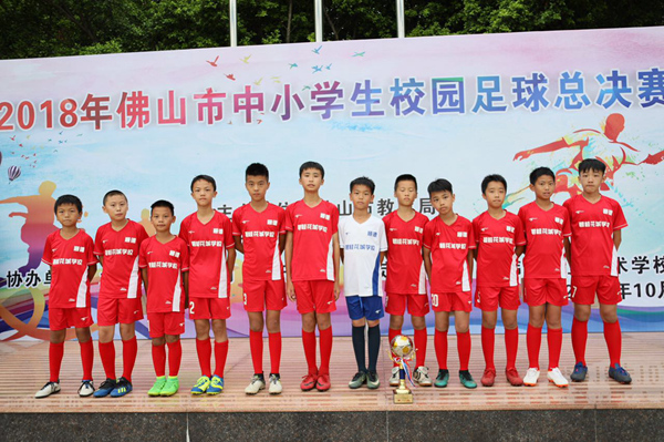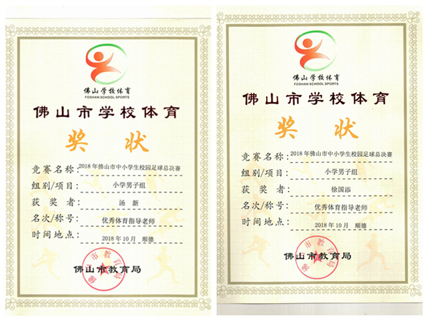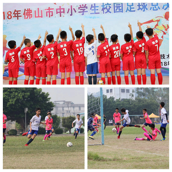 由佛山市教育局主办,顺德区教育局承办的2018年佛山市中小学生校园足球总决赛于10月12-14日在顺德举行,我校作为广东省校园足球推广学校首次代表顺德区参加了小学男子组的比赛。比赛过程中,队员们积极应战,敢打敢拼,最终以三胜一负的成绩,荣获了2018年佛山市中小学生校园足球总决赛小学男子组亚军;我校汤新老师、徐国添老师被评为佛山市优秀体育辅导员。