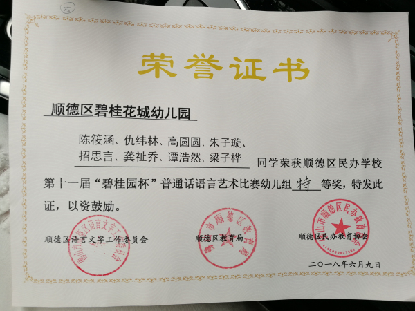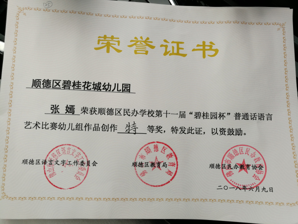为提高顺德区民办学校学生普通话语言艺术鉴赏水平,2018年6月9日,顺德区第十一届"碧桂园杯"普通话语言艺术比赛如期举行。活动以“世界真奇妙”为主题,顺德区27所幼儿园的小朋友们通过各种形式带领我们一起领略了世界的美妙和神奇,由我园的张嫣老师创作的作品《我看见》代表碧桂花城幼儿园参与本次比赛。