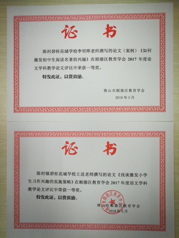 2017年度顺德区教育学会论文评比结果近日揭晓,我校教师参评的论文全部获得顺德区大奖。