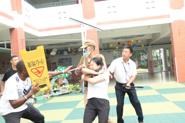 为保障幼儿在园的人身安全,进一步提高全体教职工以及幼儿的防暴意识和逃生能力,培养其应对暴力危险事件的快速反应和紧急处理能力,6月12日,我园联合花城警务室和居委会举行了一场校园防暴安全演练,全体教职员工及幼儿参加了此次演练活动。