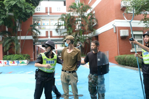 与此同时,幼儿园护园队迅速增援,与后勤人员、保安人员合力将“歹徒”制服并压制上警车。确保园内安全后,幼儿园广播宣布警报解除。
