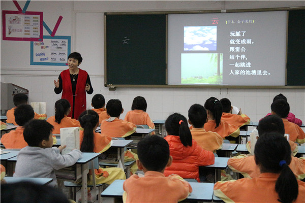 二年级的焦肃英老师上了一节《观云赏雨》的诵读课。课堂上,焦老师的脸上始终洋溢着微笑,或是对学生赞赏,或是为学生引读,或是提问启发,像温情的妈妈一样引领着孩子们徜徉在充满诗情画意的课堂上。她十分注重学生语言表达能力和想象能力的培养。