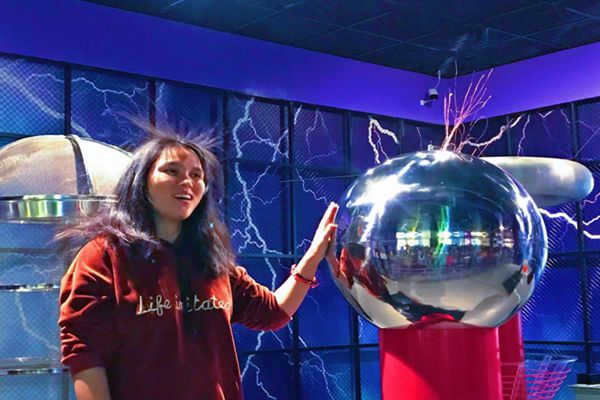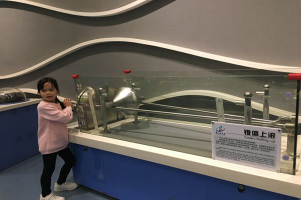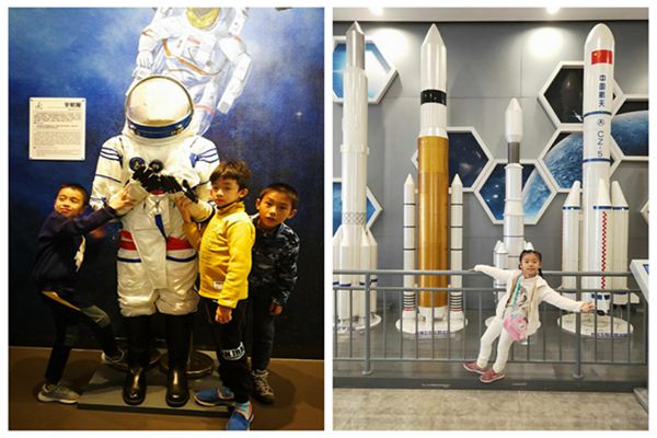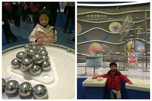 “快来,我要和火箭照相!”二楼的“科技与未来”展厅那高高的火箭向着孩子们招手。一个巨大的地球仪可以看遍世界,太空站城堡里当一回宇航员漫游太空真刺激!孩子们乐不此疲地体验时钟秋千、听话的小球、手摇发电、混沌钟摆、小小机械师,不时蹦出一个个惊叹。