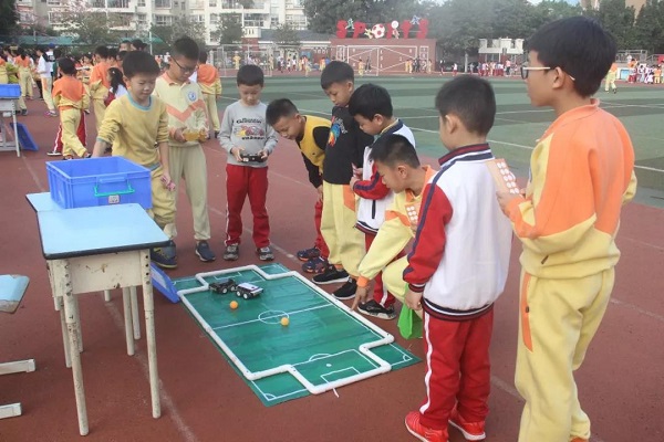12月21日下午3:30,科技节游园活动准时开始,三十个活动个个魅力四射——橡皮筋手枪现场人气爆棚,小朋友们兴高采烈地期待着一展身手;遥控对战机器人场地,孩子们的呐喊声此起彼伏;强力电磁铁展位,孩子们惊讶的眼神满是洞穿奥秘的欲望和好奇;机器人足球现场,孩子们兴奋而认真地操作着机器人等等……通过此次的科学体验活动,“科学”这颗种子一定能在每个花城学子的心中生根发芽。