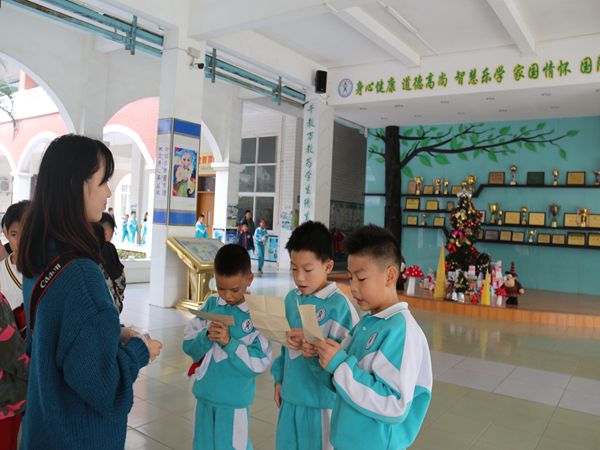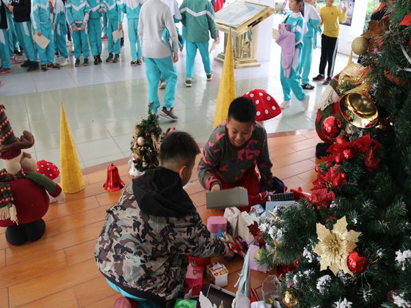 孩子们戴着圣诞帽,分小组有序地排列在英语老师面前,单个或三两个一起演唱着圣诞歌曲When Christmas comes to town,歌声悠扬,情意动人,着实好听。老师微笑着将圣诞礼物兑换券派发给他们。孩子们拿着兑换券欢天喜地来到堆满了圣诞礼物的小舞台,挑选着自己心仪的礼物并相互展示。整个现场节日气氛浓厚,欢声笑语不断。