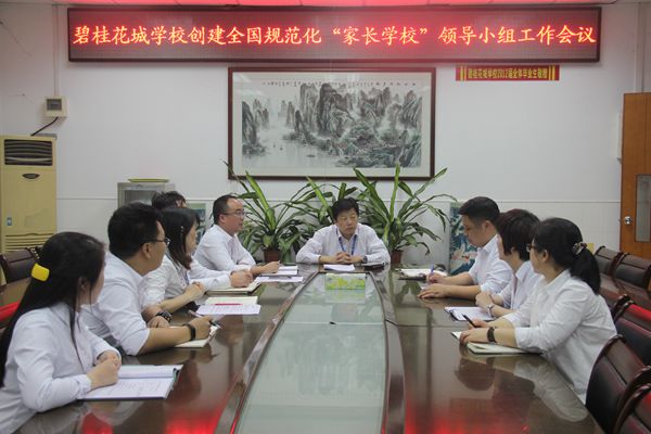 在会上,德育处姚主任先传达了市、区、镇三级教育局关于创建工作的会议精神,阐述了创建全国规范化“家长学校”工作的重要意义,接着宣读了《碧桂花城学校创建全国规范化“家长学校”工作实施方案》,就我校的创建工作做了全面的部署和安排。贺校长也强调了创建工作的重要性,希望引起全体老师的高度重视。强调要按照佛山市创建全国规范化家长学校实验区验收标准进行相关资料准备,深刻理解和体会家庭教育工作的重要性,真正将上级的要求融入到提高班级管理水平,提高教育教学水平,提高家校合作水平的工作中来。