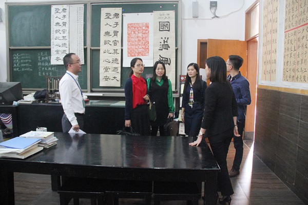 上午九点,正是校园最美的时候,调研组一行在赵定国副校长和田桂花副校长的陪同下,现场查看了学校的校园环境建设、校园文化氛围和各项硬件设施。随后,调研组与学校领导班子在二楼会议室进行了座谈。赵校长分别从学校的基本情况、办学目标和理念、办学特色和优势、周边可利用的文化资源以及特色文化展示的设想等九个方面对我校进行了整体介绍。调研组针对我校特色课程进行了更深入地咨询,田桂花副校长对此进行了详细地解读。调研组对我校的办学成绩给予了极大的肯定。