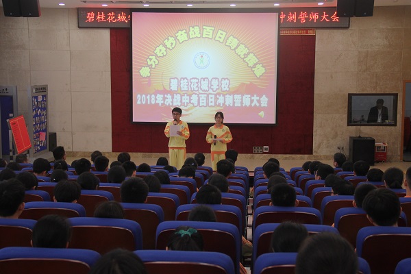 3月12日上午,阳光灿烂,春意盎然。碧桂花城学校九年级“2018届决战中考百日冲刺誓师大会”在学术报告厅隆重召开,田校长百忙中出席大会并讲话,出席大会的还有七、八年级全体师生。大会由九年级顾柏豪、游金菊两位同学主持。