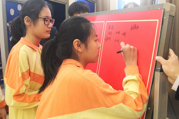 会上还隆重举行了签名仪式,在《飞得更高》的嘹亮歌声中,九年级73名学生依次在倒计时牌上庄严的签下自己的名字,也签下了自己对决战中考的承诺,会场响起了经久不息的掌声。