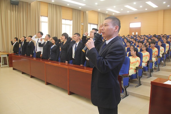 九年级全体教师坚定的誓言掀起了会议的又一个高潮。在花城名师张爱平老师的带领下,九年级教师庄严宣誓:“忠于职守,精诚团结;言传身教,以身作则……战百天,创辉煌!与学生同甘共苦,为学生保驾护航!”