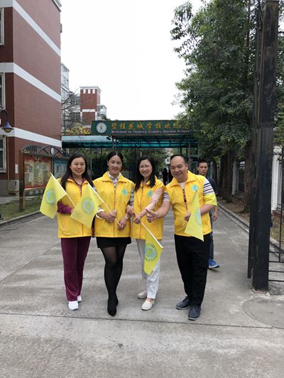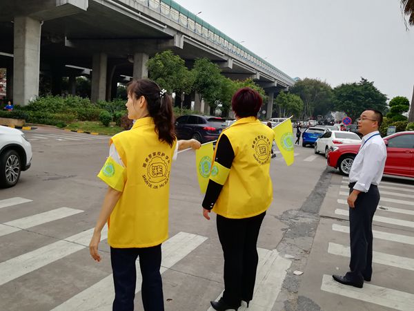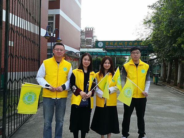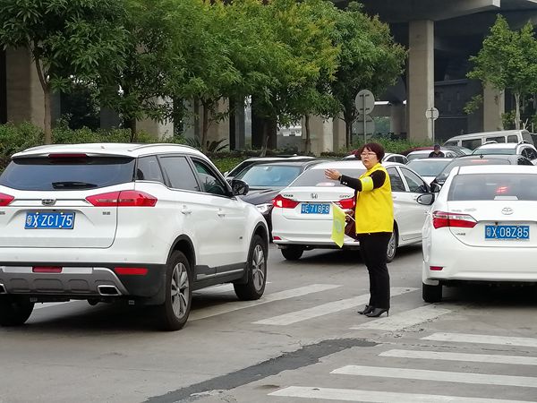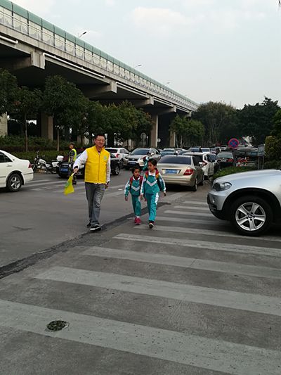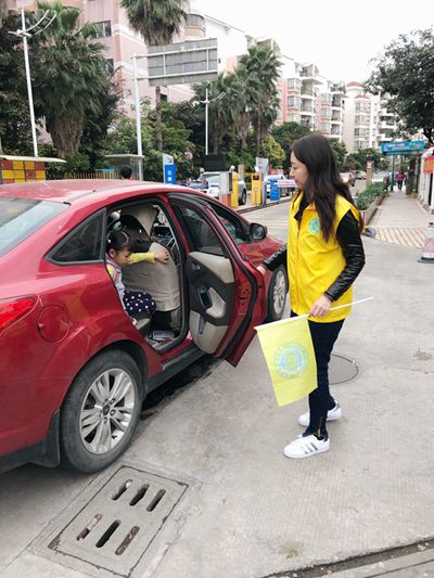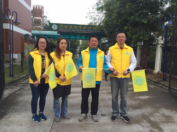 早上的后门,你会看到一道亮丽的“黄色风景线”:身穿黄马甲、臂戴黄袖章的叔叔阿姨们,挥动着手中的黄旗子,认真负责地疏导着过往车辆,一遍一遍地来回接送路边下车的孩子……活动第一天,每接过一个孩子,义工家长都会和车上的父母说:放心吧,我会把孩子安全送到学校的……