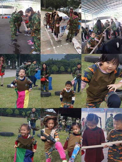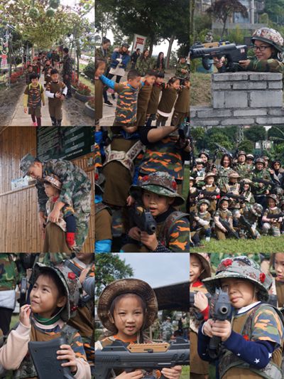 升旗结束,在教官的带领下,我们换上了军服,进行了短暂的集训——指导如何使用机枪及游戏规则。当孩子们穿上冲锋衣,拿起机枪,一个个俨然战地英雄。上场不离父子兵,你看,在爸爸的掩护下,孩子成功进入敌营并“打倒”了一个“敌兵”……