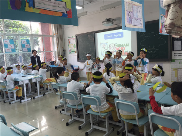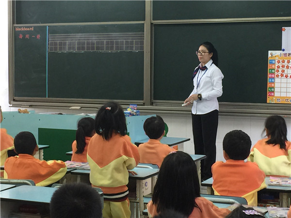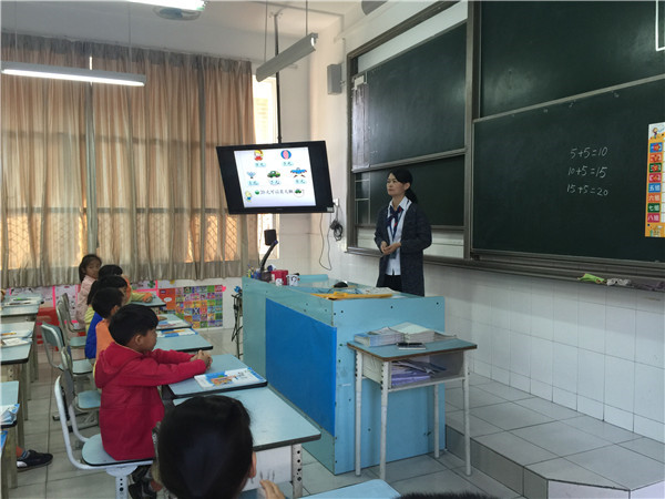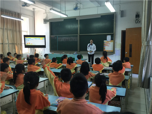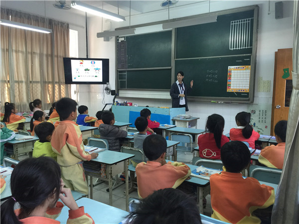 二(3)班的英语课,主题为“失物招领”。课堂上,冯敏仪老师为了调动孩子们的积极性,设置各种不同的比赛——喊出电视上快速飞过的单词,随机选数字喊出单词,记忆大比拼,击鼓传花,电话亭对话等等。在同桌合作,小组合作当中,孩子们动得多,说得多,笑得多,学得多,沉浸在欢乐的英语课堂。