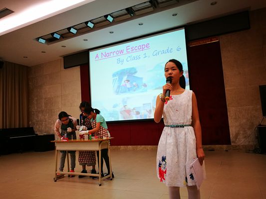 六(1)班出演的A Narrow Escape是同学们自行改编的课本剧,其中的场景变换,旁白,对话都是他们精心设计,群策群力的结果,他们深刻地演绎了灾难当前人和动物的本能反应,自然,真切,他们用语言和动作极为准确地表达了恐惧和急切的感情,表现出极强的驾驭英语的能力。