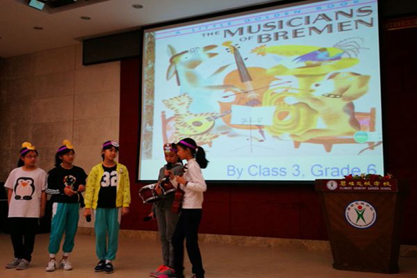 六(3)班出演的是西方名篇The Musician of Bremen,孩子们精心设计的人物头饰令人叹为观止,清新的麦穗,小提琴,小架子鼓,各种道具无一不准确地表达了孩子们对于剧情的理解,表演中有淡淡的忧伤,更有对新生活的憧憬和向往,传播着积极向上的正能量。