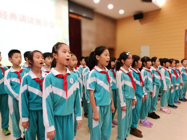 第一个环节是:经典诵读节目展示。每个班级挑选两首诗歌集体展演,脍炙人口的泰戈尔的《飞鸟集》短诗、豪放粗犷的咏史诗、活泼诙谐的儿童诗......每个班的孩子认真朗诵,深情演绎。琅琅书声,便是这世间最美的旋律。