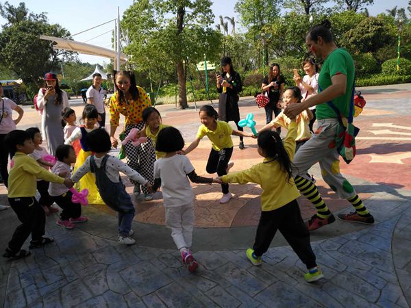 听,是哪里传来了轻快的音乐声?我们顺着声音的方向找了过去,原来葵花广场正在上演轻松幽默的小丑表演。一片阳光下,一块空地上小丑演员正带着同学们一起打篮球,一起跳绳,一起开心的做起了游戏,同学们参与其中,同时也乐在其中。