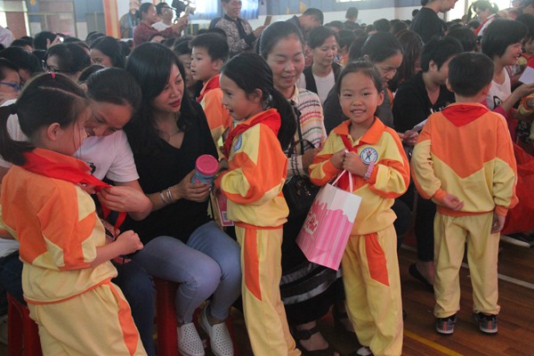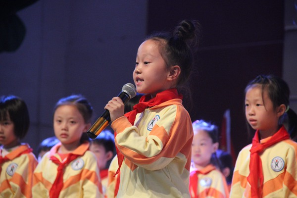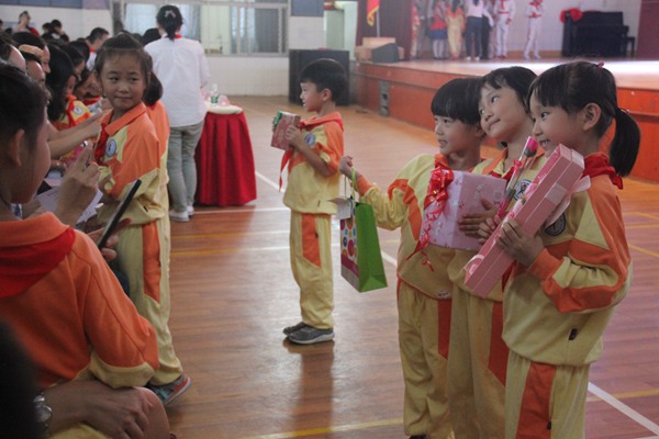 一年5班的何轻巧同学作为新少先队员代表为大家发言。“爱学习、爱劳动、爱祖国、为红领巾争光添彩。”这是全体新少先队员的心声和信念。今天是少先队员的节日,是孩子们值得自豪的日子,也是爸爸妈妈们骄傲的日子。在这个特殊的日子里,孩子们向父母送上纪念卡,父母为孩子们准备了精美的礼物。孩子们把梦想写在了卡上,父母把祝福寄托在了一个个小礼物里。