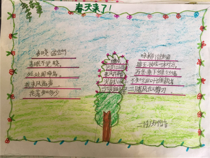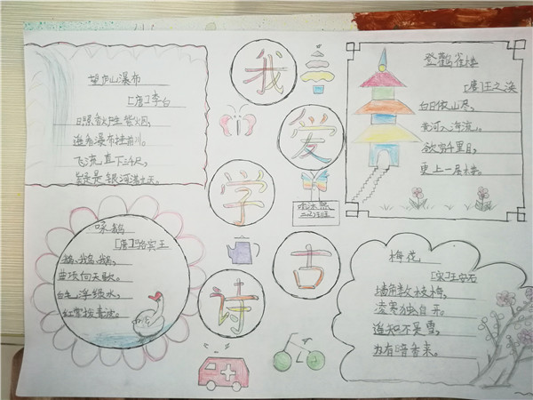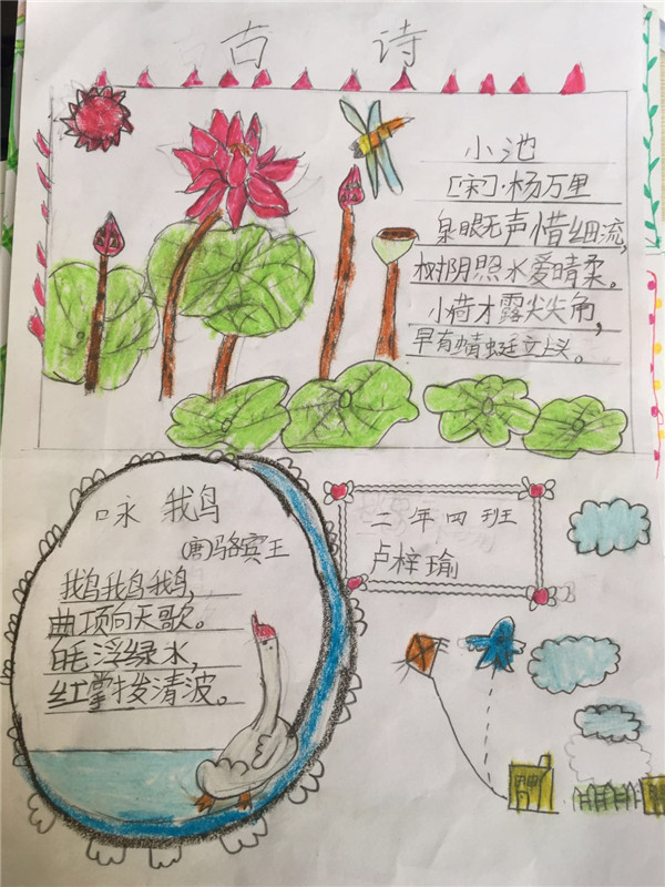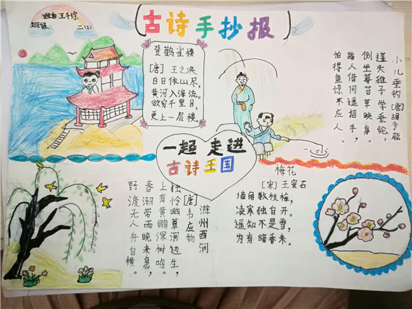 古诗词可谓是中华五千年民族文化中最灿烂的瑰宝,唐诗、宋词、元曲……在我们的脑海中烙下了深深的印象。本学期碧桂花城学校二年级同学语文主题活动是:走进古诗词。学习古诗词,不仅可以学习这种语言凝练到极致,却依然独具一格诗文意境,还能与古人对话,穿越千年。同学们通过“我爱古诗词手抄报”,来体现自己的收获。看着这些漂亮的手抄报,仿佛将我们带回了千年以前的唐朝宋代,共同聆听着诗人的吟唱。