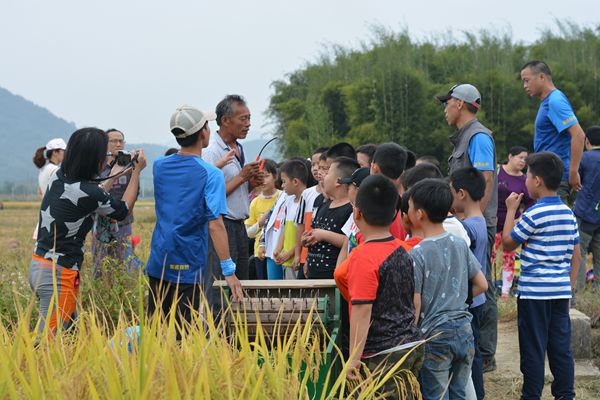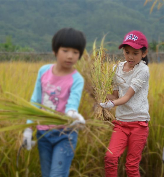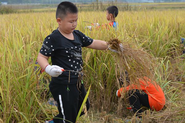 我们来到广阔的田野。蓝天白云下青翠的群山环抱着金黄的大地,风吹的稻海翻起了金色的波浪。眼前的稻穗也笑弯了腰,乐呵呵等着我们,一副原生态秋收的图景。农民爷爷告诉孩子们收割前要戴上手套,使用镰刀要刀锋向下斜割,注意手与刀的位置保持距离,收稻谷分收割,成梱,打谷三大步骤。第一次割稻谷的孩子们割得汗流浃背,轰轰的打谷机响起,这是手脚并用的技术活。"春种一粒粟,秋收万颗子"我们知道了大米的出处,孩子们在大汗淋漓中体验着劳动带来的快乐。