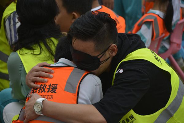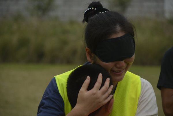 活动的高潮在于一个假设的地震场景中:父母双目失明,不能独立行走,要求孩子们带领父母逃离灾区危险地带。可,孩子们却因为自己的种种失误导致父母们身上“伤痕累累”。在背景音乐的熏陶和教练的引导之下,孩子们知道自己对父母的保护不够。而生活中,父母对自己是百般呵护,细致入微。此情此景,方知父母恩,不禁潸然泪下。
