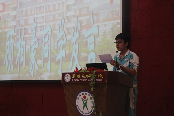 优秀学生代表九(1)班顾柏豪同学从学习态度和学习方法上介绍了自己的学习心得,他的发言,极大地鼓舞了同学们的斗志。