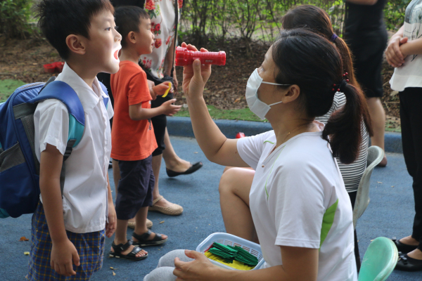 踏着阳光的清晨,小宝贝们在爸爸妈妈的陪伴下,个个神气十足地踏进幼儿园,像以往一样有礼貌地鞠躬问好,保健医生为孩子们细心地做好晨检。