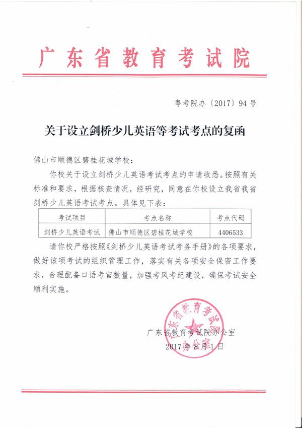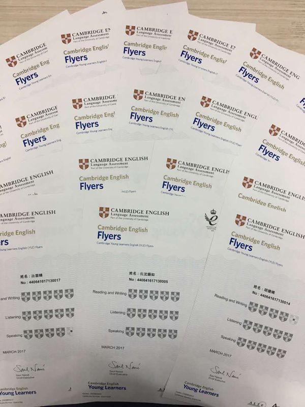 2017年初我校申请为剑桥少儿英语考试的考点,2017年8月1日剑桥少儿考试中心通过了我校的申请,并发来了公函批准我校成为广东省剑桥少儿考试考点。我校考生从2018年开始就可以在本校校园考级,相信他们会不断攀登高峰,勇创佳绩。