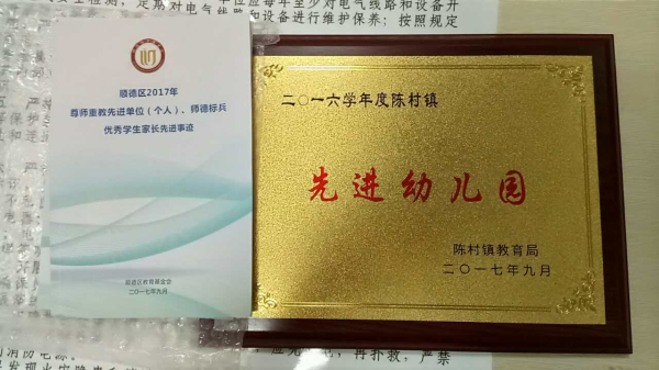 日前,我园喜获“二零一六学年度陈村镇先进幼儿园”称号。我园已连续十三年获得这一殊荣。满载镇政府镇教育局和社区民众对优质教育的期待,碧桂花城幼儿园一直坚持“给孩子一个五星级的家”,从创园至今十五载风雨中,积极建设新样态幼儿园。