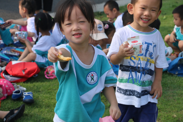 一眨眼,孩子们步行到了社区的大草坪。在软软的草地上,孩子们围坐成一个个大圈圈,从小背包里拿出零食,你送我一颗糖,我给你一个小面包。分享过后,小朋友们轮流进行表演,有的唱歌、有的跳舞、有的念诗歌。还有一些班级的小朋友玩起了丢手绢、网小鱼等游戏。把平日幼儿园里的活动搬到大自然这个“大教室”里,孩子们感受到了课堂以外的乐趣。