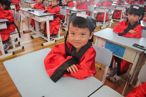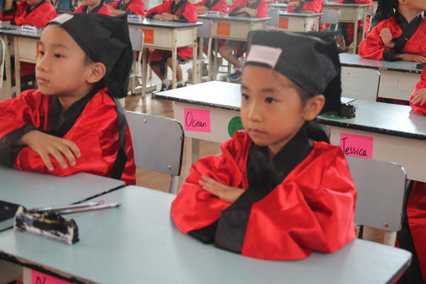 开笔礼一共分为“正衣冠”、“拜师”、“朱砂启智”、“击鼓明志”、“描红”、“诵读经典”等六个环节。下午三点半,锣鼓喧天,在贺校长的致辞声中“开笔礼”拉开了序幕。孩子们先自正衣冠、互正衣冠,最后师正衣冠,目的就是告诉孩子们“衣冠不仅仅只是意味着遮羞,更重要的是反映人的精神面貌,所以要先正衣冠,然后才能明事理。”正衣冠结束后,孩子们一拜先师孔子,二拜师长,三拜同学,以此表达对师长、对同学的尊敬。“朱砂启智”这一环节又被称为“开天眼”,其寓意是孩子从此眼明心明,好读书,读好书。