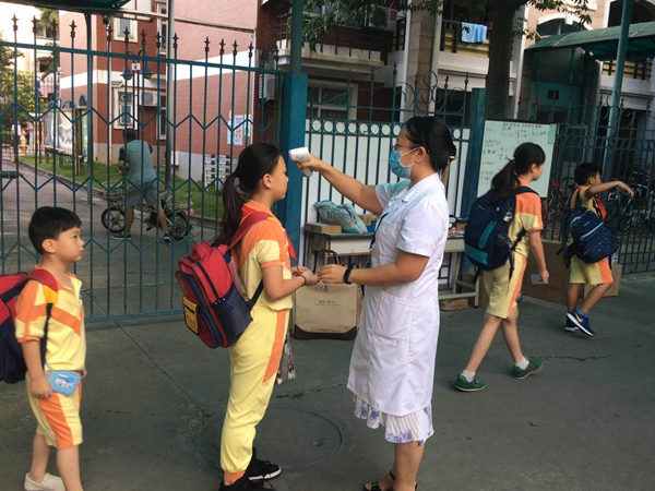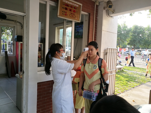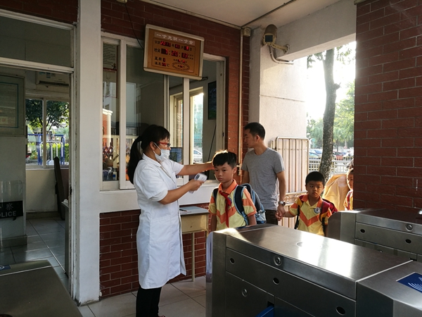 因为这段时间登革热疫情严峻,学校前后门从本周一开始启动了晨检测体温行动,每个进校园的学生都要接受体温检测,发烧达到38度的学生会立刻通知家长接去医院就诊。