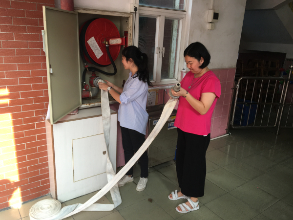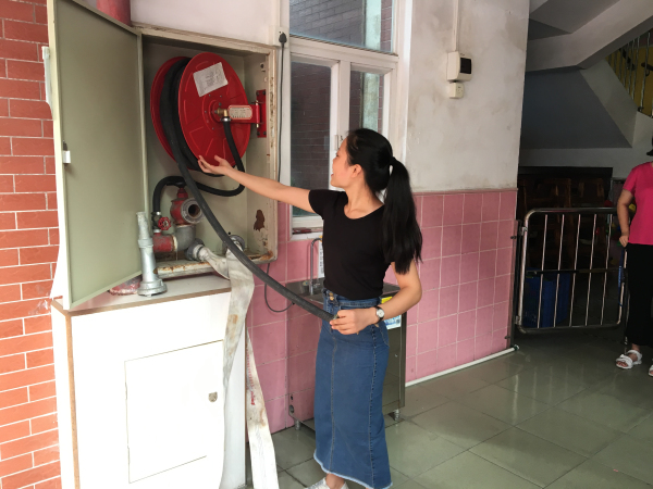 此外,郝队长还讲解了消防栓水管接上和拆卸的方法。示范讲解后,老师们进行了实操,切身感受了灭火器和消防栓的使用方法,加深了印象。