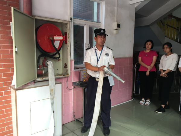 培训中郝队长给老师们详细地讲解干粉灭火器和消防栓的使用方法。使用干粉灭火器前需要把灭火器颠倒几次,再拔去保险销,离火源一定的距离后瞄准火苗根部喷射。