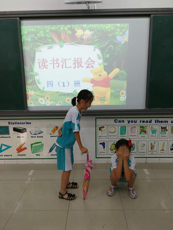 四年级以《小木偶的故事》开展了读书汇报活动。《小木偶的故事》是一篇寓意深刻的童话,它教会我们,凡事不能够死板,需要适时调整自己才能把事情做得更好。在学生理解了文章之后,老师设计了以下的课本剧:首先帮全班进行分组,六人一组,组长是小木偶,其余的分别是老木匠、小红狐、熊、小白兔、老婆婆及小女巫。他们先仿照书本来念,然后用自己的话语来表达。在组内进行表演,接着到讲台前面表演。通过课本剧的表演,激发了学生阅读的热情,加深了对文本的理解,增强对了课文的理解及对做人的思考。