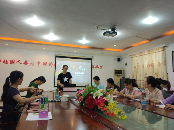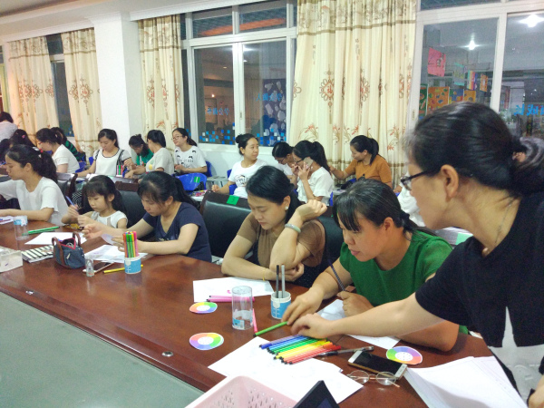 色彩的搭配和图像的构造是影响环境氛围的重要因素,而这些因素对于幼儿园来说就更加重要了。2017年6月20日晚,碧桂花城幼儿园专业美术老师白颖雯给老师们开展了《色彩搭配与简易环创》的专题培训。