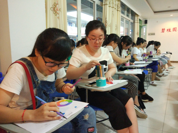 作为一名专业的美术老师,白老师在美术方面的造诣大家是有目共睹的。在整个培训中,为了帮助老师们更好地理解与接受,白老师由浅入深,先从基础的三原色出发,引申出色彩的多种搭配方式,生动形象地给老师们讲解了单一色系配色、相邻色配色、互补色配色、对比色配色、冷暖色系配色等多种配色技巧。此外,为了达到更好的学习效果,白颖雯老师还精心为各位老师准备了一份配色练习和一个“十二色相环”。理论与实际的结合,老师们在色彩搭配方面的认识更进了一步。