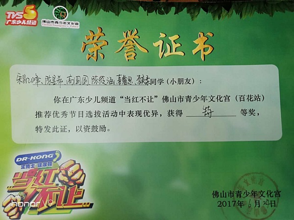 2017年6月24日,广东TVS5少儿频道2017年度重磅节目《当红不让》佛山市青少年文化宫(百花站)推荐优秀节目选拔活动在禅城区百花广场火热进行。比赛当天,烈日当空,艳阳高照,但我园参赛小选手们的热情丝毫不减。