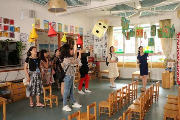 梁园长向各位同行介绍了我园的办学理念、办园成果、课题开展以及我园的国际教育。随后50余位幼教同行观摩了我园的阳光体育活动,他们被形式多样、科学但又不失有趣的各项活动所吸引,对我们的阳光体育活动赞不绝口。在接下来的参观交流环节,幼教同行们分别参观了我园的环境创设、功能室以及班级区域建设。同行们边走、边看、边谈,相互交流着自己的所见、所思、所得。