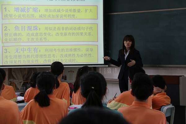 姚主任用一个小游戏“挑战不可能”导入新课,让学生在轻松活泼的气氛中进入学习状态,并在游戏中认识到了筛选信息的重要性。接着,姚主任深入分析了近十年中考中说明文阅读的出题情况和考题特点,让学生分组合作探讨说明文的知识点以及说明文阅读的答题技巧,总结出说明文选择题的三步答题法,还用“小贴士”总结出说明文选择题常见的错误选项类型——增减扩缩、鱼目混珠、无中生有等。最后,用一篇往年中考说明文阅读题进行巩固提升。