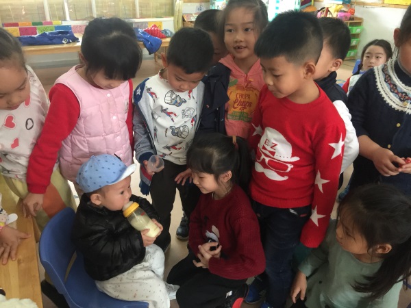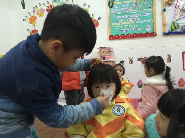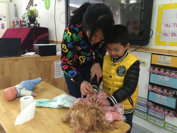 老师晚上学习,白天就把知识传授给我们的孩子。瞧,孩子们照顾小婴儿的熟练程度一点都不亚于我们的成人。孩子们学习如何帮宝宝戴帽子、穿袜子和小鞋子,学习如何冲牛奶;学习如何帮娃娃穿纸尿裤;学会如何照顾比自己小的弟弟妹妹;学习日常护理和急救知识。