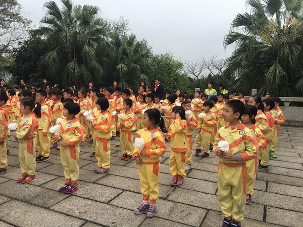 为了更好地体验小学生活,清明节临近之际,碧桂花城幼儿园大班40余名幼儿代表于2017年3月29日跟随碧桂花城学校一年级的哥哥姐姐前往北滘西海抗日烈士陵园举行扫墓活动。