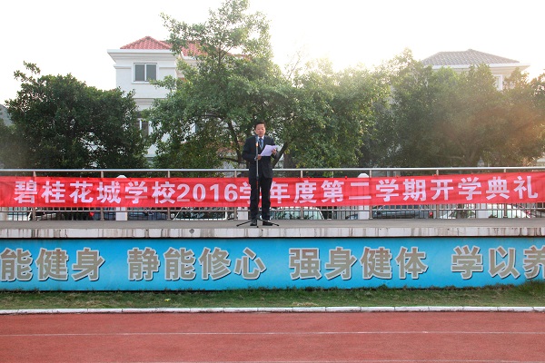 度过了“花市灯如昼”的元宵佳节,在这春寒料峭、春光明媚的日子,新学期开始啦!2月13日上午8点,碧桂花城学校全体师生隆重举行“2016学年度第二学期开学典礼”。